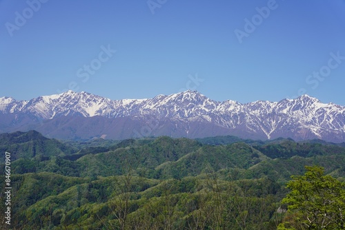 Obraz premium 信州 小川村の風景 残雪の北アルプス(爺ヶ岳、鹿島槍ヶ岳、五竜岳)と新緑の里山