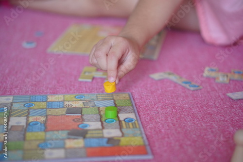 Obraz premium 小学生の子供がボードゲーム遊びを楽しんでいる様子。駒を動かしている手元。