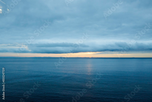 Obraz premium 重い曇天だが、水平線の隙間からかすかに朝日が見えている。 日本国静岡県伊豆半島、伊豆急行線車内 - 2022年10月8日。伊豆半島の海岸線を走る列車、伊豆急行線の車窓からの風景。