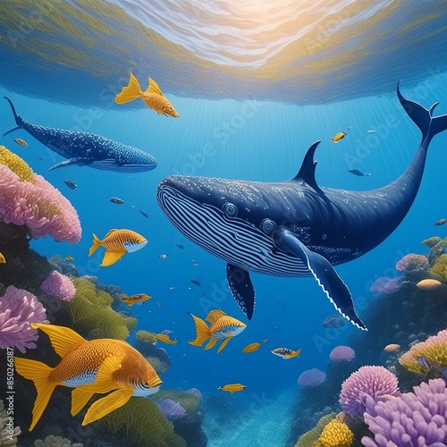 © 하연 채, Naklejka premium 고래와 열대 물고기들