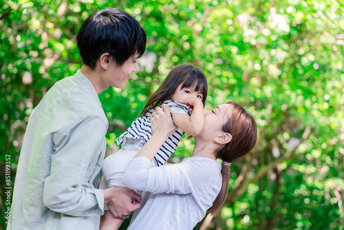 Fototapeta premium 緑の中で子供を抱っこする家族