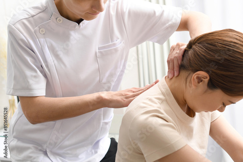 Fototapeta premium 女性患者にマッサージ整体の施術をする男性
