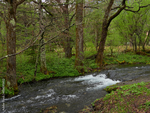 © zheng qiang, Obraz premium 初夏の雨の日の国立公園上高地の森と渓流の風景