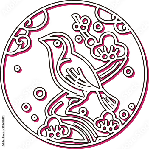 Fototapeta premium カラーシャドウの円形シンプル花札 鶯 如月 梅 2月 梅に鶯