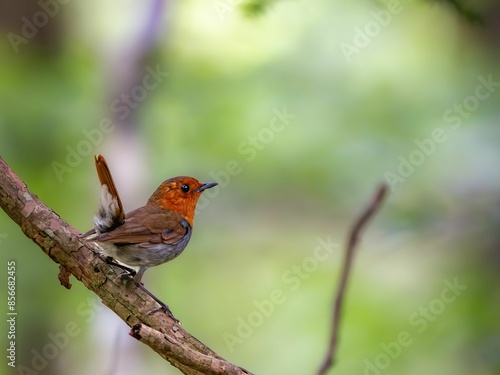 Obraz premium 森の中で静かに枝に留まっているコマドリの雄