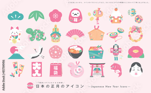 Fototapeta premium 2025年巳年のかわいいシンプルなお正月の縁起物アイコンイラストセット年賀素材_ヘビ・へび年