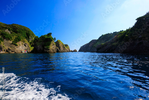 Obraz premium ヒリゾ浜渡船の漁船に乗って、海に出るスキンダイバー、シュノーケラーたち。日本国静岡県伊豆半島賀茂郡南伊豆町中木から渡し船で渡るヒリゾ浜にて。...