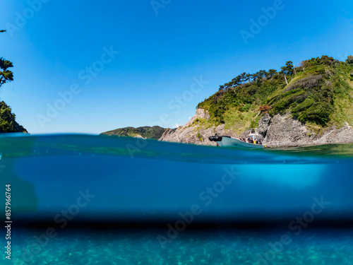 © d3_plus, Fototapeta premium ヒリゾ浜渡船の漁船の美しい半水面撮影。日本国静岡県伊豆半島賀茂郡南伊豆町中木から渡し船で渡るヒリゾ浜にて。 2022年10月撮影。
