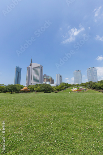 Fototapeta premium 幕張の新緑の公園から高層ビジネスビル街を臨む