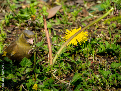 © ichihira, Obraz premium たんぽぽとカワラヒワ