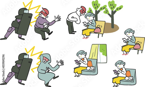 Fototapeta premium スマホを操作するシニア女性と怪しい人 怪しい人を防ごうとする盾を持った機動隊員 セットのストック素材