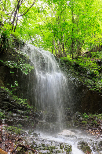 © d3_plus, Obraz premium 苔むした岩と新緑の崖から落ちる美しい小さな滝。日本国神奈川県相模原市、早戸川林道にて。 2024年6月撮影。