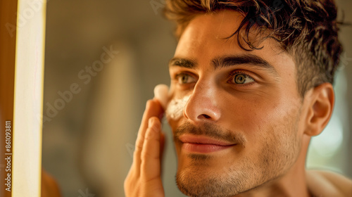 © IEPPEI, Obraz premium 男性のスキンケアルーティン:フェイスクリームの塗布、メンズ美容