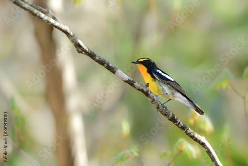 Fototapeta premium 初夏から夏に高原の森で見られる黄色とオレンジが美しい野鳥キビタキ