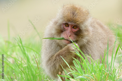 Naklejka premium 長野県の地獄谷温泉近くで見られる人懐っこい、好奇心旺盛な野生のニホンザル