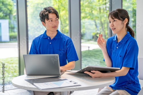 Obraz premium 男女の介護士の打合せ