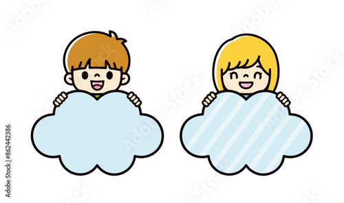 © SAKUTA, Obraz premium テキスト、バナー、広告用の雲の形のボードを持つ男の子と女の子のイラストセット