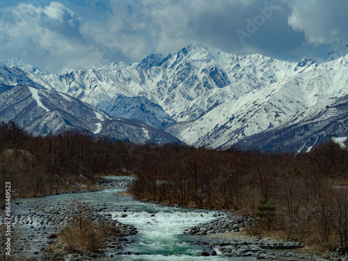 © RATM, Fototapeta premium 雪の北アルプスと松川 長野県白馬村