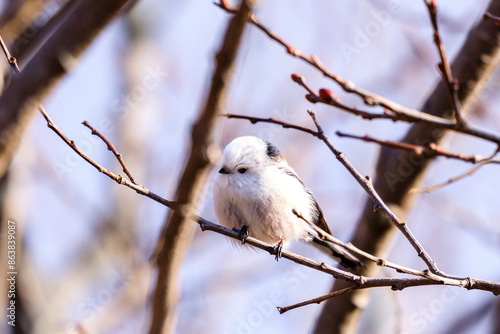 Obraz premium 北海道日高町、小枝でたたずむ雪の妖精・シマエナガ【12月】
