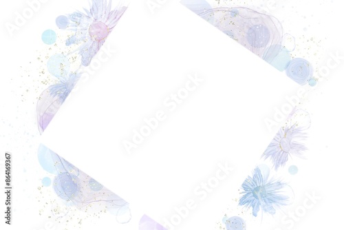 © Queso, Obraz premium 春夏用のアルコールインクアート抽象バナー。水色と紫のシャボン玉と花と四角いスペース