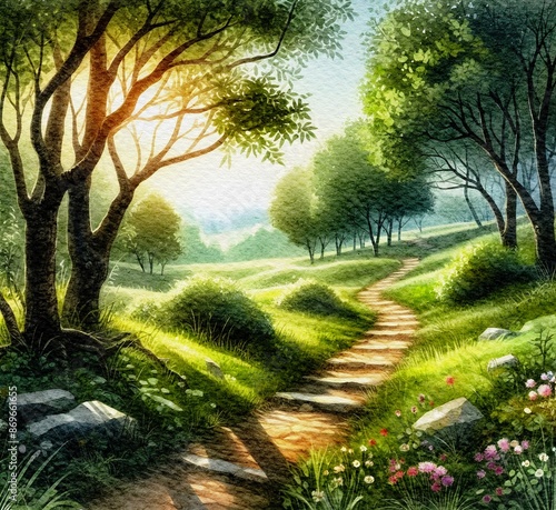 © 영 초, Obraz premium 나무,풍경,수채화,숲속,오솔길,봄,그림,풍경화