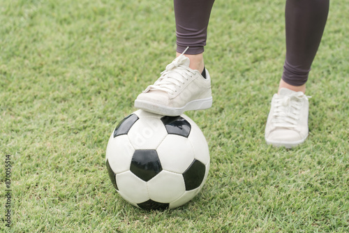 © buritora, Fototapeta premium サッカー場でユニフォームを着てサッカー・フットサルの練習をする日本人女性