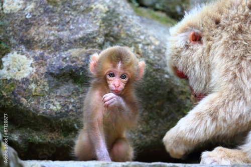 Naklejka premium ニホンザルの親子 かわいい猿の赤ちゃん