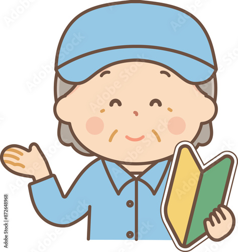 © ミミクリ, Obraz premium 初心者マークを持って案内する作業服のシニア女性