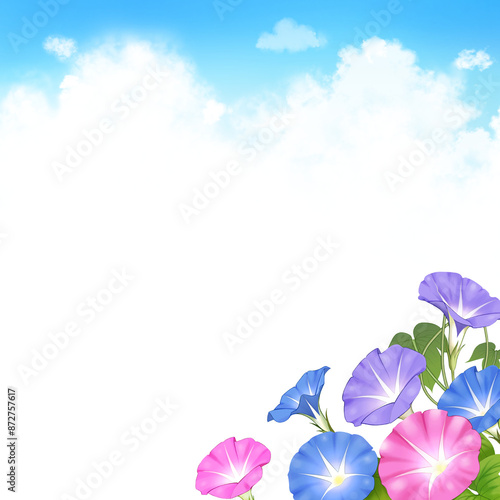 Fototapeta premium 朝顔 入道雲 水彩画 素材 和 和風 枠 晴れ 涼しい おしゃれ シンプル 風物詩 キャンペーン レジャー 暑中見舞い お中元 正方形