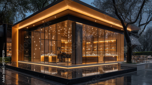 Obraz premium 夏日夜晚灯火辉煌的珠宝店玻璃房建筑