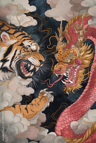 © dadakko, Obraz premium 縁起物の虎とピンクの龍