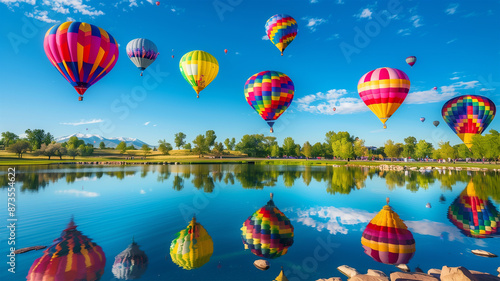 Obraz premium カラフルな熱気球が浮かぶ湖の風景