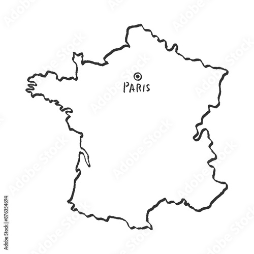 Obraz premium 手描きのシンプルでおしゃれなフランスの白地図 - 首都パリの位置をマークした線画マップ