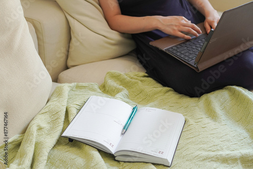 Fototapeta premium 家のソファーに座って、ノートパソコンで仕事をする若いビジネスウーマン
