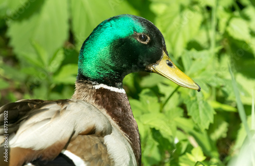 Obraz premium Утка (селезень) на фоне зеленой травы крупным планом