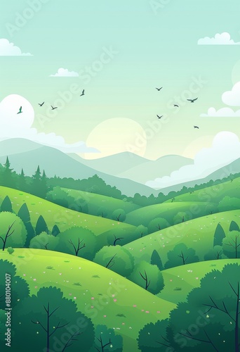 © HUOSEN, Obraz premium 緑の山 漫画スタイル ミニマリストフラットベクター背景
