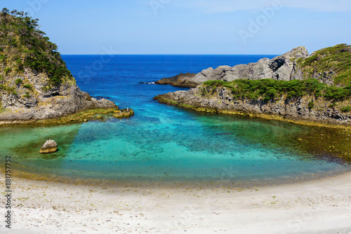 © d3_plus, Obraz premium 式根島の美しい青い海と白い砂浜の泊海水浴場。東京都伊豆諸島式根島 - 2021年3月