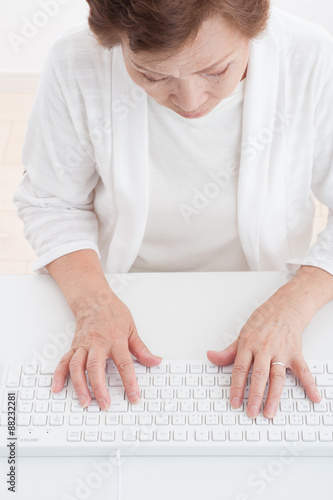 Fototapeta premium パソコンのキーボードを使っている高齢者の女性