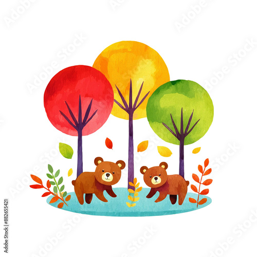© n.s, Naklejka premium 秋の森に住むかわいい子グマのイラスト 白背景の切り抜き