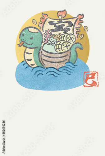 © ribbon_s, Obraz premium 年賀状 2025 年賀 テンプレート 宝船 巳年 巳 へび 墨絵 フレーム 背景 イラスト