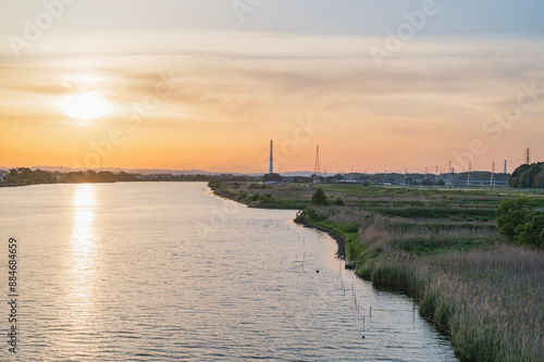 Obraz premium 茨城 夕暮れの那珂川(ひたちなか市・湊大橋から)