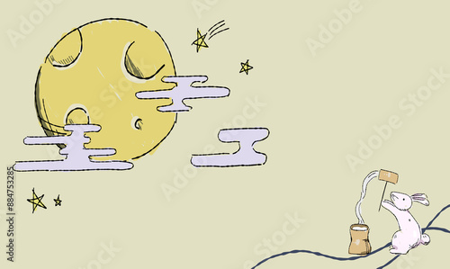 Fototapeta premium 星で彩る、お月見の背景イラスト、餅を搗くうさぎとともに。ペン画風の手描きタッチ。 模様付き。