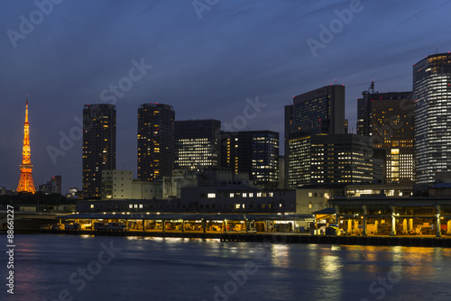 © k2_keyleter, Fototapeta premium 隅田川夕景/勝どきより築地市場越しに見た新橋・浜松町方面の夕方の景色