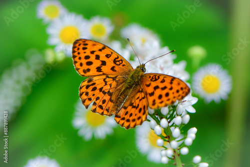 Obraz premium 初夏の高原で出会えるオレンジと黒の翅がとても美しいチョウ、コヒョウモン