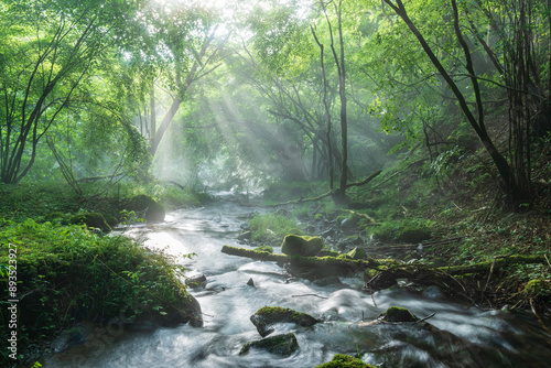 © Umibozze, Obraz premium 富士宮市から富士山の伏流水に差し込む光芒