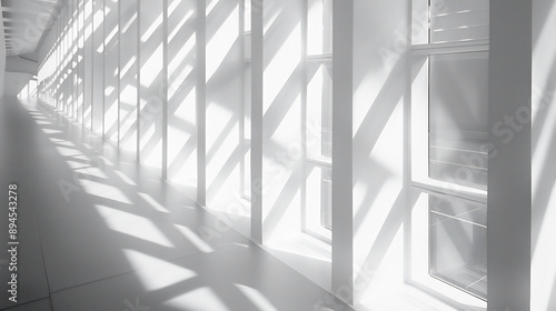 Fototapeta premium 光と影が白い壁に幾何学的な形を作り出している、モノクロ写真アート風背景グラフィック