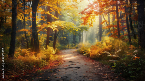Obraz premium 가을 새벽 울창한 숲 속 사람 없는 산책로