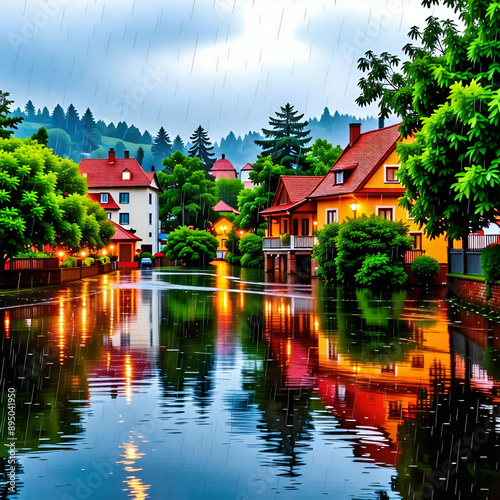 © 재영 이, Obraz premium 장마철 비에 젖은 마을의 전경