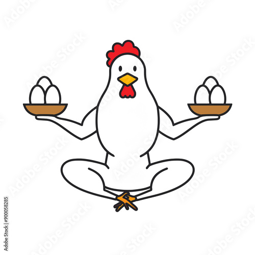 © n.s, Obraz premium ヨーガのポーズで卵を持っている白い鶏のシュールなイラスト 白背景の切り抜き