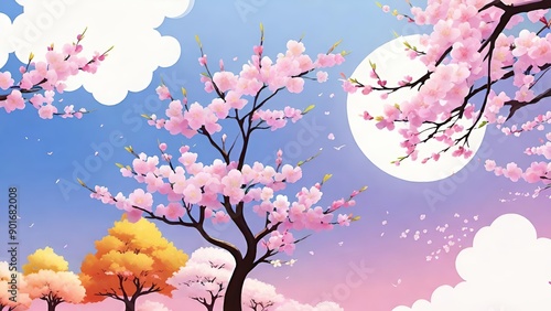 Fototapeta premium 桜と満月が照らす幻想的な夜の風景